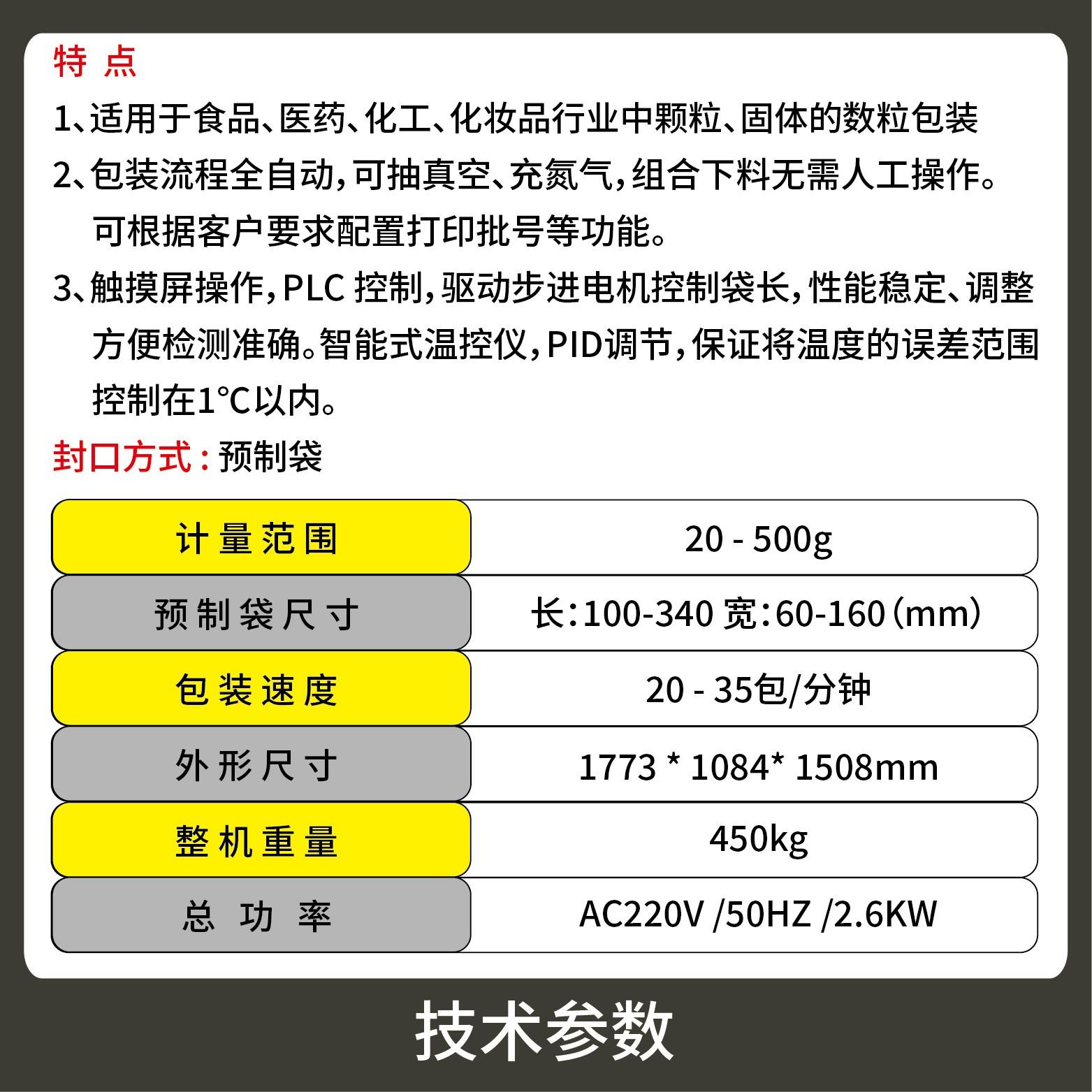 2、包裝流程全自動(dòng),無需人工操作,可抽真空、充氮?dú)猓M合下料??筛鶕?jù)充填物料的性質(zhì)選配不同的下料結(jié)構(gòu),且可根據(jù)客戶要求配置打印批號(hào)等功能。
